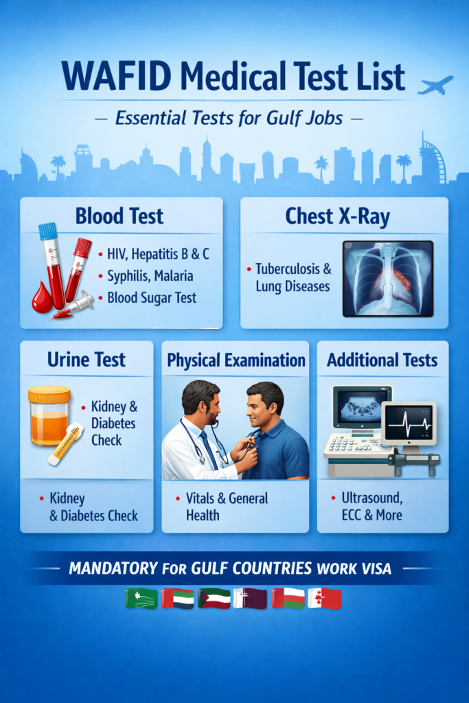 If you are planning to work in Gulf countries, you must complete a medical examination through the WAFID system (previously known as GAMCA). This medical test is mandatory for workers traveling to countries such as Saudi Arabia, United Arab Emirates, Kuwait, Qatar, Oman, and Bahrain.